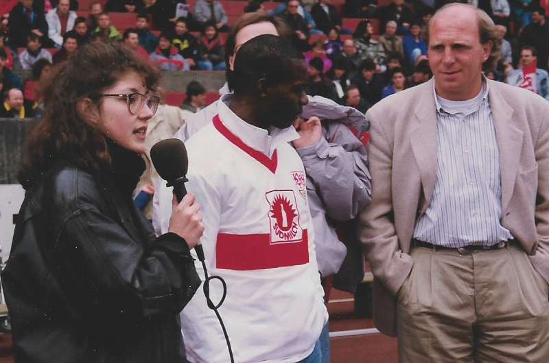 Interview mit Ben Johnson (m.) und Dieter Hoeneß (r.) im Neckarstadion Stuttgart, Februar 1991